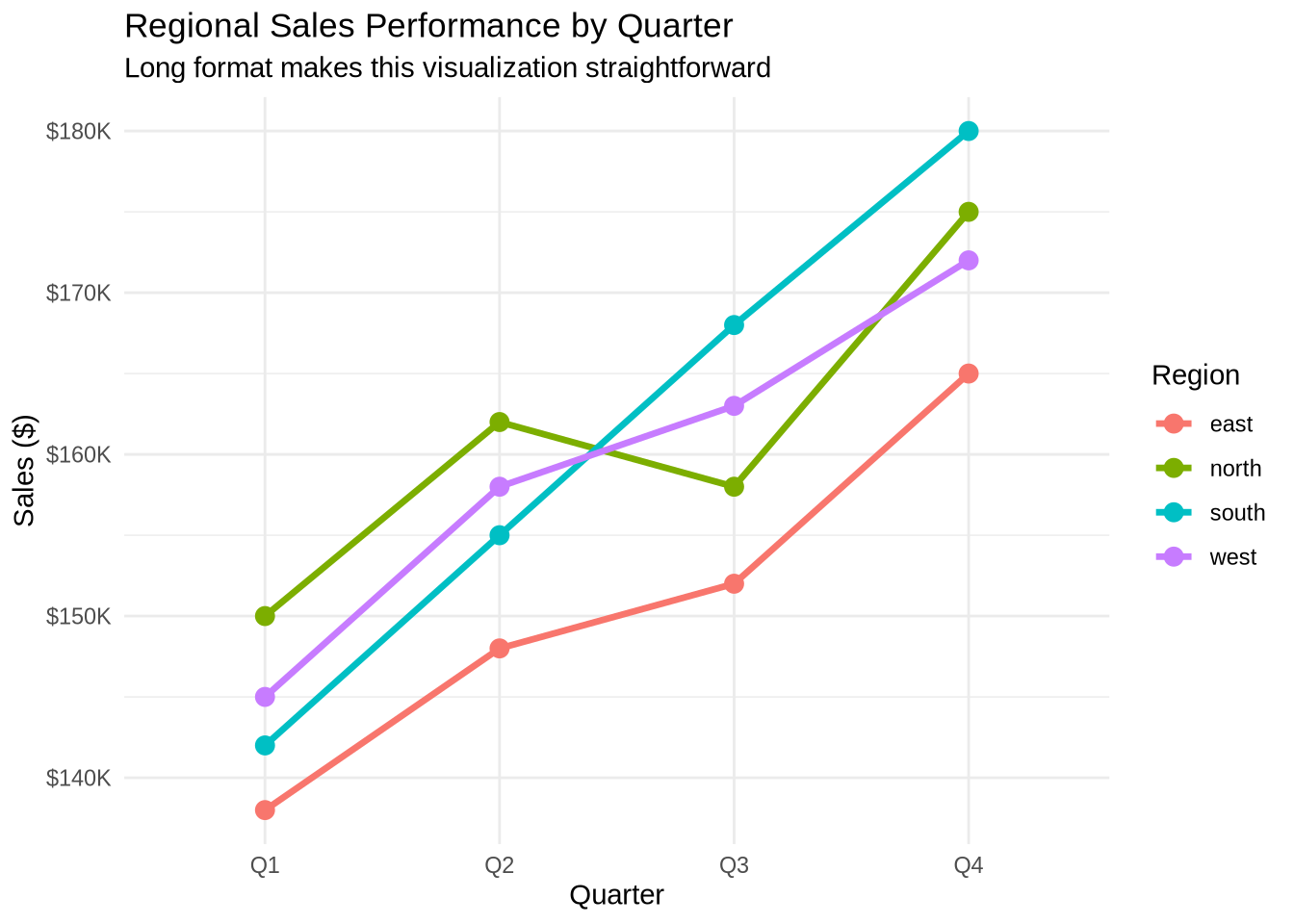 # Demonstrate why ggplot2 prefers long formatlibrary(ggplot2)# This works beautifully with long formatsales_long %>%ggplot(aes(x = quarter, y = sales, color = region, group = region)) +geom_line(size =1.2) +geom_point(size =3) +scale_y_continuous(labels = scales::dollar_format(scale =1e-3, suffix ="K")) +labs(title ="Regional Sales Performance by Quarter",subtitle ="Long format makes this visualization straightforward",x ="Quarter",y ="Sales ($)",color ="Region" ) +theme_minimal()