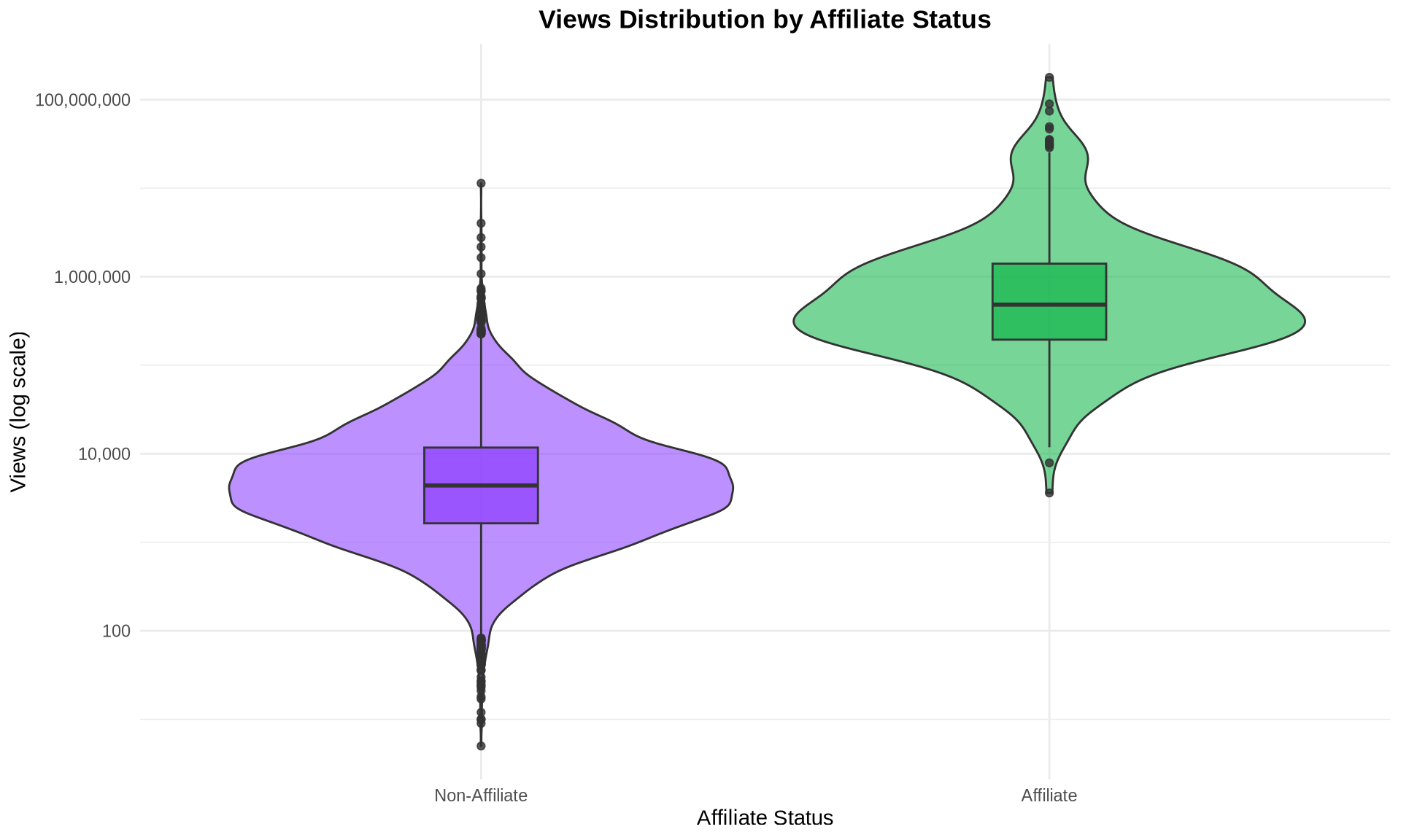 cat("T-test: Affiliate vs Non-Affiliate (log-transformed views)\n")T-test: Affiliate vs Non-Affiliate (log-transformed views)