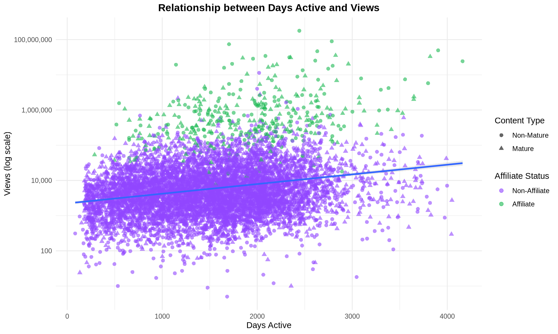 format.args = list(big.mark = ","))| Mature_content | Affiliate | Count | Avg_Views | Median_Views | Avg_Days_Active |