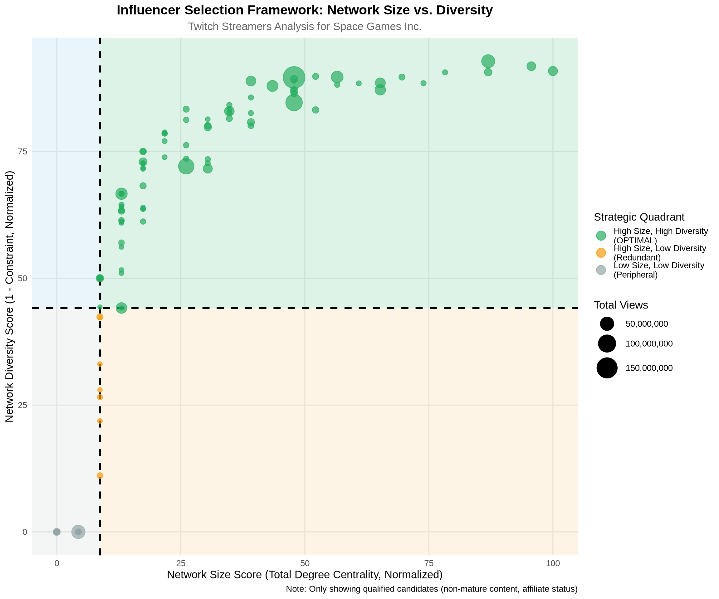 Quality Over Quantity: Our analysis shows that qualified candidates in the optimal quadrant represent a small, strategic subset of all streamers, demonstrating that strategic network position is rare and valuable.