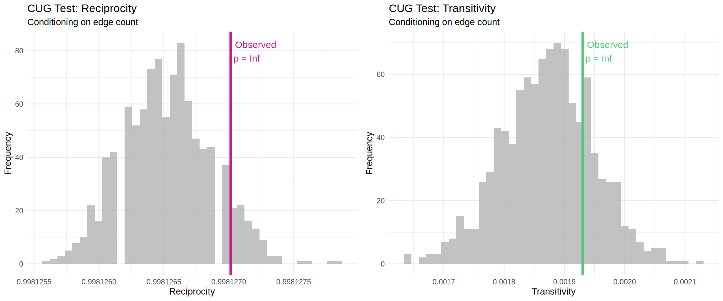 Conditional Uniform Graph (CUG) Tests: A more stringent test that conditions on the observed edge count. This tests whether reciprocity and transitivity are higher/lower than expected given the network’s density.