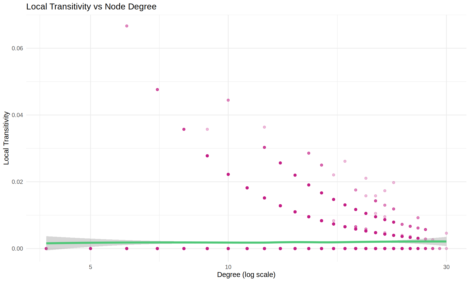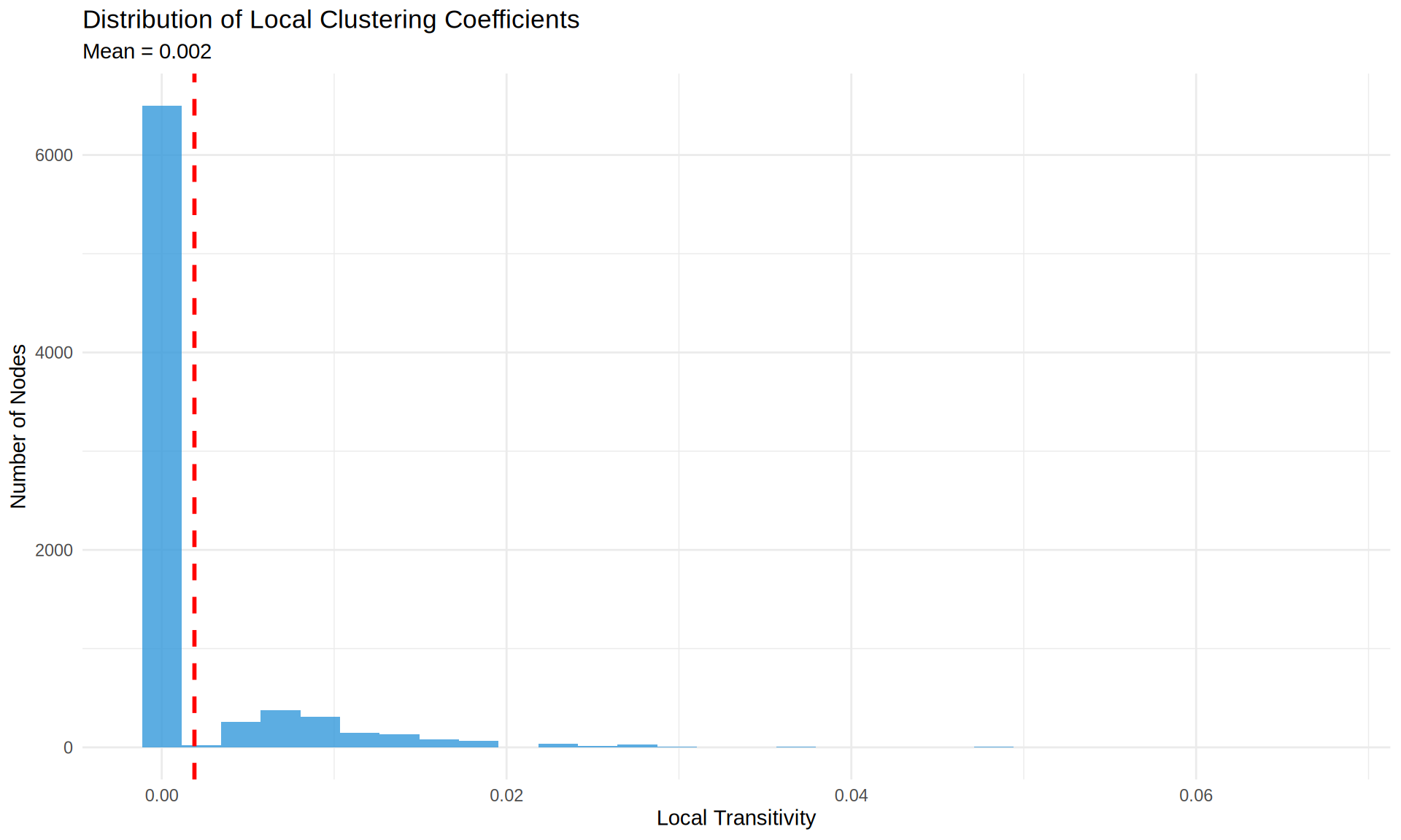 - Global transitivity: 0.2% (proportion of closed triangles)